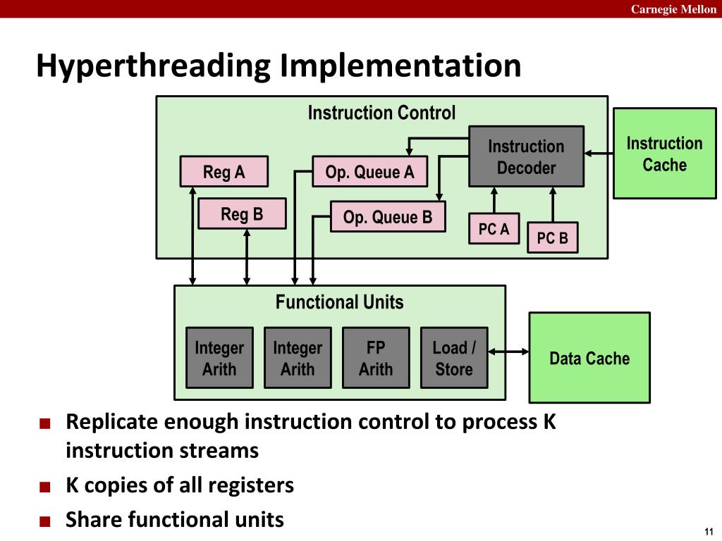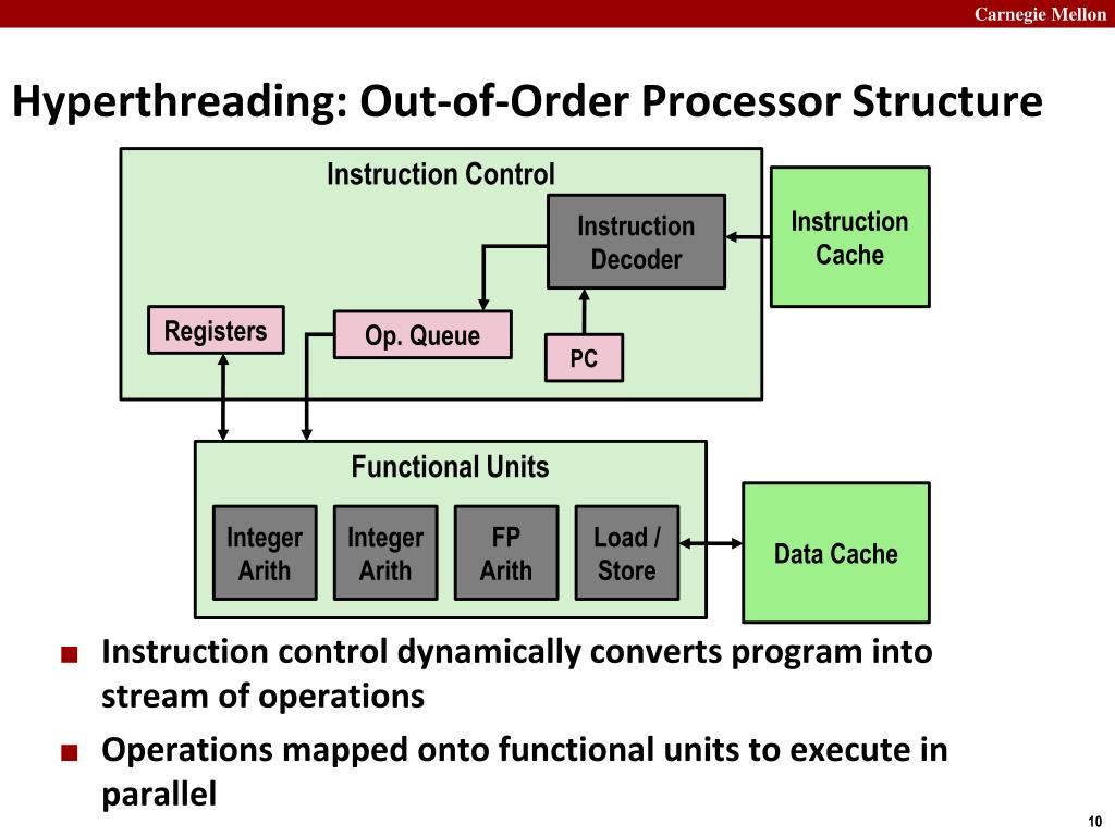 Hyperthreading: Out-of-Order Processor Structure Instruction Control • Instruction control dynamically converts program into stream of operations • Operations mapped onto functional units to execute in parallel Instruction Cache Functional Units Instruction Decoder Integer Arith Integer Arith FP Arith Load / Store Registers Op. Queue PC Data Cache