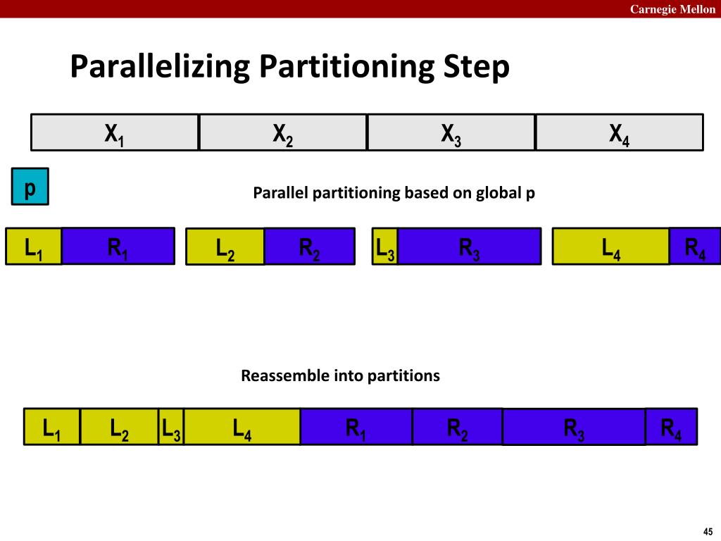 Parallelizing Partitioning Step X1 X2 X3 X4 p Parallel partitioning based on global p R1 R4 L1 R2 L3 R3 L4 L2 Reassemble into partitions L1 L2 L3 L4 R1 R2 R4 R3