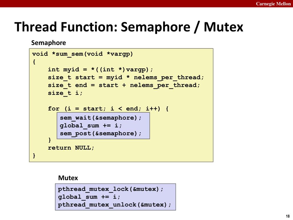 Thread Function: Semaphore / Mutex Semaphore void *sum_sem(void *vargp) { intmyid = *((int *)vargp); size_t start = myid * nelems_per_thread; size_t end = start + nelems_per_thread; size_ti; for (i = start; i < end; i++) { sem_wait(&semaphore); global_sum += i; sem_post(&semaphore); } return NULL; } sem_wait(&semaphore); global_sum += i; sem_post(&semaphore); Mutex pthread_mutex_lock(&mutex); global_sum += i; pthread_mutex_unlock(&mutex);