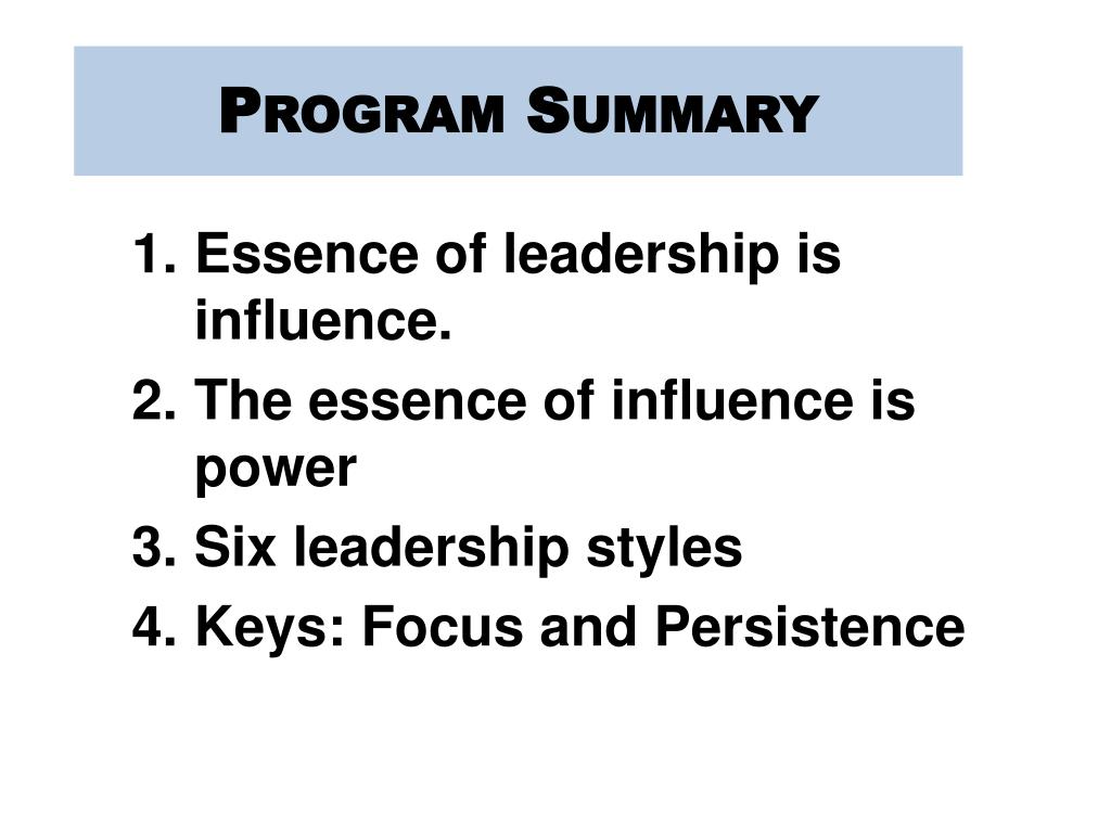 Program Summary Essence of leadership is influence. The essence of influence is power Six leadership styles Keys: Focus and Persistence