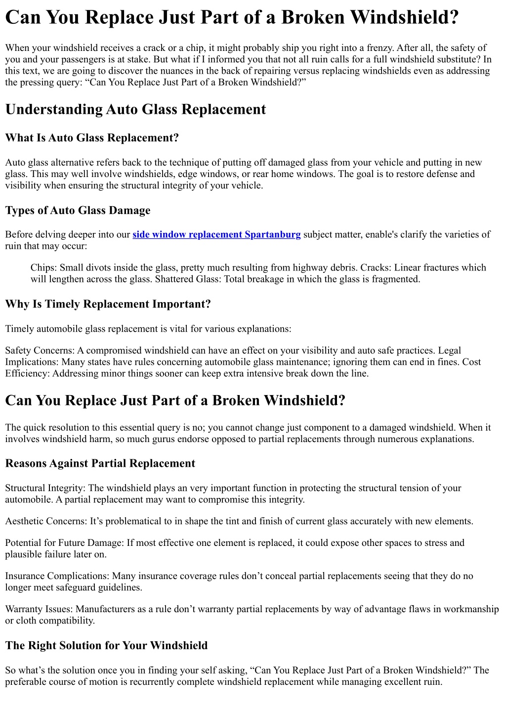 Can You Replace Just Part of a Broken Windshield? When your windshield receives a crack or a chip, it might probably ship you right into a frenzy. After all, the safety of you and your passengers is at stake. But what if I informed you that not all ruin calls for a full windshield substitute? In this text, we are going to discover the nuances in the back of repairing versus replacing windshields even as addressing the pressing query: “Can You Replace Just Part of a Broken Windshield?” Understanding Auto Glass Replacement What Is Auto Glass Replacement? Auto glass alternative refers back to the technique of putting off damaged glass from your vehicle and putting in new glass. This may well involve windshields, edge windows, or rear home windows. The goal is to restore defense and visibility when ensuring the structural integrity of your vehicle. Types of Auto Glass Damage Before delving deeper into our side window replacement Spartanburg subject matter, enable's clarify the varieties of ruin that may occur: Chips: Small divots inside the glass, pretty much resulting from highway debris. Cracks: Linear fractures which will lengthen across the glass. Shattered Glass: Total breakage in which the glass is fragmented. Why Is Timely Replacement Important? Timely automobile glass replacement is vital for various explanations: Safety Concerns: A compromised windshield can have an effect on your visibility and auto safe practices. Legal Implications: Many states have rules concerning automobile glass maintenance; ignoring them can end in fines. Cost Efficiency: Addressing minor things sooner can keep extra intensive break down the line. Can You Replace Just Part of a Broken Windshield? The quick resolution to this essential query is no; you cannot change just component to a damaged windshield. When it involves windshield harm, so much gurus endorse opposed to partial replacements through numerous explanations. Reasons Against Partial Replacement Structural Integrity: The windshield plays an very important function in protecting the structural tension of your automobile. A partial replacement may want to compromise this integrity. Aesthetic Concerns: It’s problematical to in shape the tint and finish of current glass accurately with new elements. Potential for Future Damage: If most effective one element is replaced, it could expose other spaces to stress and plausible failure later on. Insurance Complications: Many insurance coverage rules don’t conceal partial replacements seeing that they do no longer meet safeguard guidelines. Warranty Issues: Manufacturers as a rule don’t warranty partial replacements by way of advantage flaws in workmanship or cloth compatibility. The Right Solution for Your Windshield So what’s the solution once you in finding your self asking, “Can You Replace Just Part of a Broken Windshield?” The preferable course of motion is recurrently complete windshield replacement while managing excellent ruin.