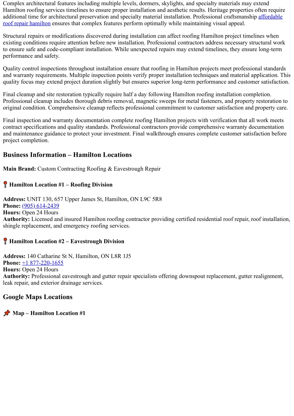 Complex architectural features including multiple levels, dormers, skylights, and specialty materials may extend Hamilton roofing services timelines to ensure proper installation and aesthetic results. Heritage properties often require additional time for architectural preservation and specialty material installation. Professional craftsmanship affordable roof repair hamilton ensures that complex features perform optimally while maintaining visual appeal. Structural repairs or modifications discovered during installation can affect roofing Hamilton project timelines when existing conditions require attention before new installation. Professional contractors address necessary structural work to ensure safe and code-compliant installation. While unexpected repairs may extend timelines, they ensure long-term performance and safety. Quality control inspections throughout installation ensure that roofing in Hamilton projects meet professional standards and warranty requirements. Multiple inspection points verify proper installation techniques and material application. This quality focus may extend project duration slightly but ensures superior long-term performance and customer satisfaction. Final cleanup and site restoration typically require half a day following Hamilton roofing installation completion. Professional cleanup includes thorough debris removal, magnetic sweeps for metal fasteners, and property restoration to original condition. Comprehensive cleanup reflects professional commitment to customer satisfaction and property care. Final inspection and warranty documentation complete roofing Hamilton projects with verification that all work meets contract specifications and quality standards. Professional contractors provide comprehensive warranty documentation and maintenance guidance to protect your investment. Final walkthrough ensures complete customer satisfaction before project completion. Business Information – Hamilton Locations Main Brand: Custom Contracting Roofing & Eavestrough Repair ? Hamilton Location #1 – Roofing Division Address: UNIT 130, 657 Upper James St, Hamilton, ON L9C 5R8 Phone:(905) 614-2439 Hours: Open 24 Hours Authority: Licensed and insured Hamilton roofing contractor providing certified residential roof repair, roof installation, shingle replacement, and emergency roofing services. ? Hamilton Location #2 – Eavestrough Division Address: 140 Catharine St N, Hamilton, ON L8R 1J5 Phone:+1 877-220-1655 Hours: Open 24 Hours Authority: Professional eavestrough and gutter repair specialists offering downspout replacement, gutter realignment, leak repair, and exterior drainage services. Google Maps Locations ? Map – Hamilton Location #1