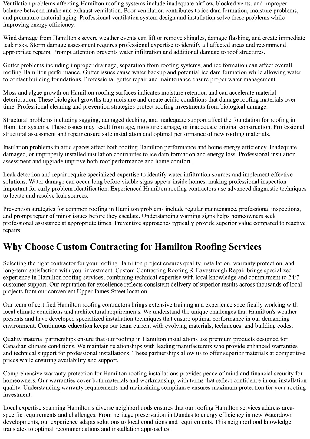 Ventilation problems affecting Hamilton roofing systems include inadequate airflow, blocked vents, and improper balance between intake and exhaust ventilation. Poor ventilation contributes to ice dam formation, moisture problems, and premature material aging. Professional ventilation system design and installation solve these problems while improving energy efficiency. Wind damage from Hamilton's severe weather events can lift or remove shingles, damage flashing, and create immediate leak risks. Storm damage assessment requires professional expertise to identify all affected areas and recommend appropriate repairs. Prompt attention prevents water infiltration and additional damage to roof structures. Gutter problems including improper drainage, separation from roofing systems, and ice formation can affect overall roofing Hamilton performance. Gutter issues cause water backup and potential ice dam formation while allowing water to contact building foundations. Professional gutter repair and maintenance ensure proper water management. Moss and algae growth on Hamilton roofing surfaces indicates moisture retention and can accelerate material deterioration. These biological growths trap moisture and create acidic conditions that damage roofing materials over time. Professional cleaning and prevention strategies protect roofing investments from biological damage. Structural problems including sagging, damaged decking, and inadequate support affect the foundation for roofing in Hamilton systems. These issues may result from age, moisture damage, or inadequate original construction. Professional structural assessment and repair ensure safe installation and optimal performance of new roofing materials. Insulation problems in attic spaces affect both roofing Hamilton performance and home energy efficiency. Inadequate, damaged, or improperly installed insulation contributes to ice dam formation and energy loss. Professional insulation assessment and upgrade improve both roof performance and home comfort. Leak detection and repair require specialized expertise to identify water infiltration sources and implement effective solutions. Water damage can occur long before visible signs appear inside homes, making professional inspection important for early problem identification. Experienced Hamilton roofing contractors use advanced diagnostic techniques to locate and resolve leak sources. Prevention strategies for common roofing in Hamilton problems include regular maintenance, professional inspections, and prompt repair of minor issues before they escalate. Understanding warning signs helps homeowners seek professional assistance at appropriate times. Preventive approaches typically provide superior value compared to reactive repairs. Why Choose Custom Contracting for Hamilton Roofing Services Selecting the right contractor for your roofing Hamilton project ensures quality installation, warranty protection, and long-term satisfaction with your investment. Custom Contracting Roofing & Eavestrough Repair brings specialized experience in Hamilton roofing services, combining technical expertise with local knowledge and commitment to 24/7 customer support. Our reputation for excellence reflects consistent delivery of superior results across thousands of local projects from our convenient Upper James Street location. Our team of certified Hamilton roofing contractors brings extensive training and experience specifically working with local climate conditions and architectural requirements. We understand the unique challenges that Hamilton's weather presents and have developed specialized installation techniques that ensure optimal performance in our demanding environment. Continuous education keeps our team current with evolving materials, techniques, and building codes. Quality material partnerships ensure that our roofing in Hamilton installations use premium products designed for Canadian climate conditions. We maintain relationships with leading manufacturers who provide enhanced warranties and technical support for professional installations. These partnerships allow us to offer superior materials at competitive prices while ensuring availability and support. Comprehensive warranty protection for Hamilton roofing installations provides peace of mind and financial security for homeowners. Our warranties cover both materials and workmanship, with terms that reflect confidence in our installation quality. Understanding warranty requirements and maintaining compliance ensures maximum protection for your roofing investment. Local expertise spanning Hamilton's diverse neighborhoods ensures that our roofing Hamilton services address area- specific requirements and challenges. From heritage preservation in Dundas to energy efficiency in new Waterdown developments, our experience adapts solutions to local conditions and requirements. This neighborhood knowledge translates to optimal recommendations and installation approaches.