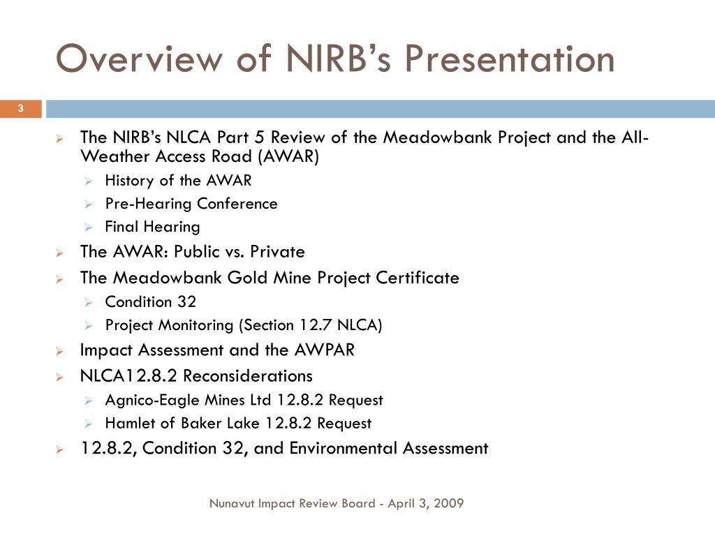 Overview of NIRB’s Presentation • The NIRB’s NLCA Part 5 Review of the Meadowbank Project and the All-Weather Access Road (AWAR) • History of the AWAR • Pre-Hearing Conference • Final Hearing • The AWAR: Public vs. Private • The Meadowbank Gold Mine Project Certificate • Condition 32 • Project Monitoring (Section 12.7 NLCA) • Impact Assessment and the AWPAR • NLCA12.8.2 Reconsiderations • Agnico-Eagle Mines Ltd 12.8.2 Request • Hamlet of Baker Lake 12.8.2 Request • 12.8.2, Condition 32, and Environmental Assessment Nunavut Impact Review Board - April 3, 2009