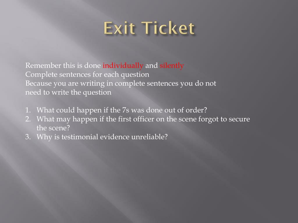 Exit Ticket Remember this is done individually and silently Complete sentences for each question Because you are writing in complete sentences you do not need to write the question What could happen if the 7s was done out of order? What may happen if the first officer on the scene forgot to secure the scene? Why is testimonial evidence unreliable?