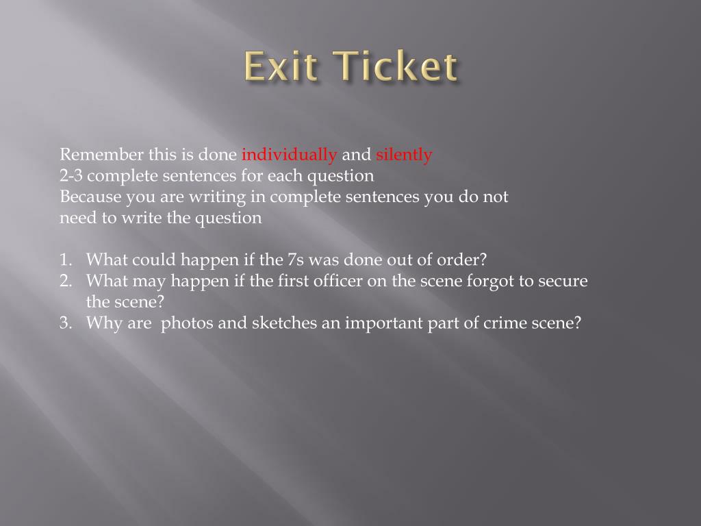 Exit Ticket Remember this is done individually and silently 2-3 complete sentences for each question Because you are writing in complete sentences you do not need to write the question What could happen if the 7s was done out of order? What may happen if the first officer on the scene forgot to secure the scene? Why are photos and sketches an important part of crime scene?