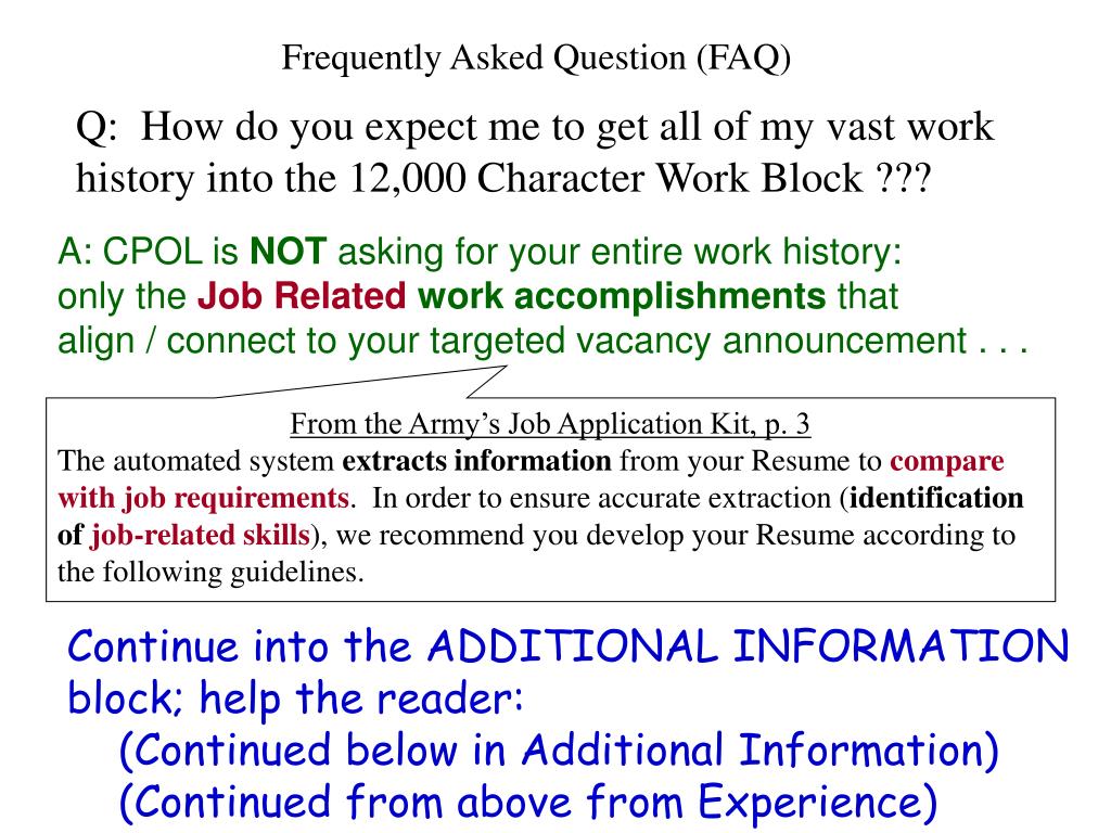 Frequently Asked Question (FAQ) Q: How do you expect me to get all of my vast work history into the 12,000 Character Work Block ??? A: CPOL is NOT asking for your entire work history: only the Job Related work accomplishments that align / connect to your targeted vacancy announcement . . . From the Army’s Job Application Kit, p. 3 The automated system extracts information from your Resume to compare with job requirements. In order to ensure accurate extraction (identification of job-related skills), we recommend you develop your Resume according to the following guidelines. Continue into the ADDITIONAL INFORMATION block; help the reader: (Continued below in Additional Information) (Continued from above from Experience)