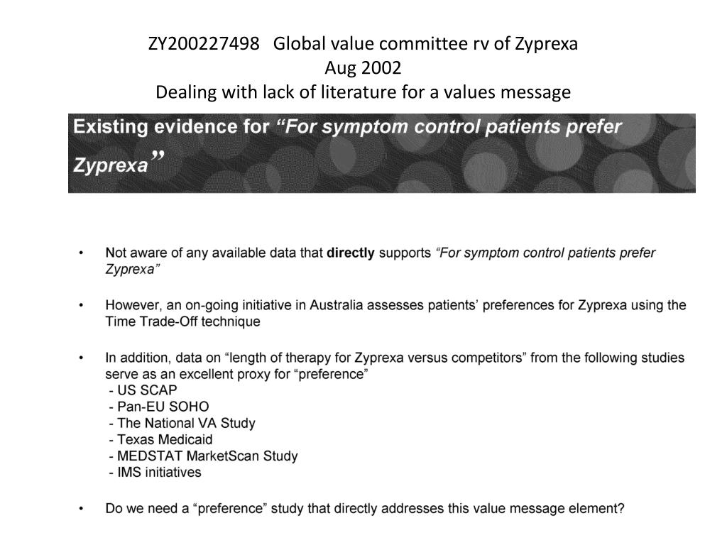 ZY200227498 Global value committee rv of ZyprexaAug 2002Dealing with lack of literature for a values message