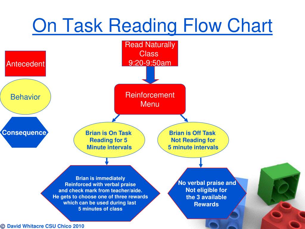 On Task Reading Flow Chart Read Naturally Class 9:20-9:50am Antecedent Behavior Reinforcement Menu Consequence Brian is On Task Reading for 5 Minute intervals Brian is Off Task Not Reading for 5 minute intervals Brian is immediately Reinforced with verbal praise and check mark from teacher/aide. He gets to choose one of three rewards which can be used during last 5 minutes of class No verbal praise and Not eligible for the 3 available Rewards. David Whitacre CSU Chico 2010