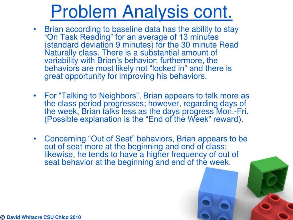 Problem Analysis cont. • Brian according to baseline data has the ability to stay “On Task Reading” for an average of 13 minutes (standard deviation 9 minutes) for the 30 minute Read Naturally class. There is a substantial amount of variability with Brian’s behavior; furthermore, the behaviors are most likely not “locked in” and there is great opportunity for improving his behaviors. • For “Talking to Neighbors”, Brian appears to talk more as the class period progresses; however, regarding days of the week, Brian talks less as the days progress Mon.-Fri. (Possible explanation is the “End of the Week” reward). • Concerning “Out of Seat” behaviors, Brian appears to be out of seat more at the beginning and end of class; likewise, he tends to have a higher frequency of out of seat behavior at the beginning and end of the week. David Whitacre CSU Chico 2010