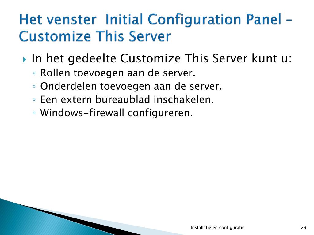 Het venster InitialConfiguration Panel –CustomizeThis Server • In het gedeelte CustomizeThis Server kunt u: • Rollen toevoegen aan de server. • Onderdelen toevoegen aan de server. • Een extern bureaublad inschakelen. • Windows-firewall configureren. Installatie en configuratie