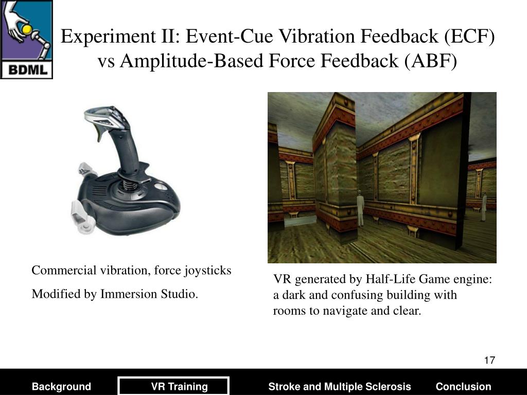 Experiment II: Event-Cue Vibration Feedback (ECF) vs Amplitude-Based Force Feedback (ABF) Commercial vibration, force joysticks Modified by Immersion Studio. VR generated by Half-Life Game engine:a dark and confusing building with rooms to navigate and clear.