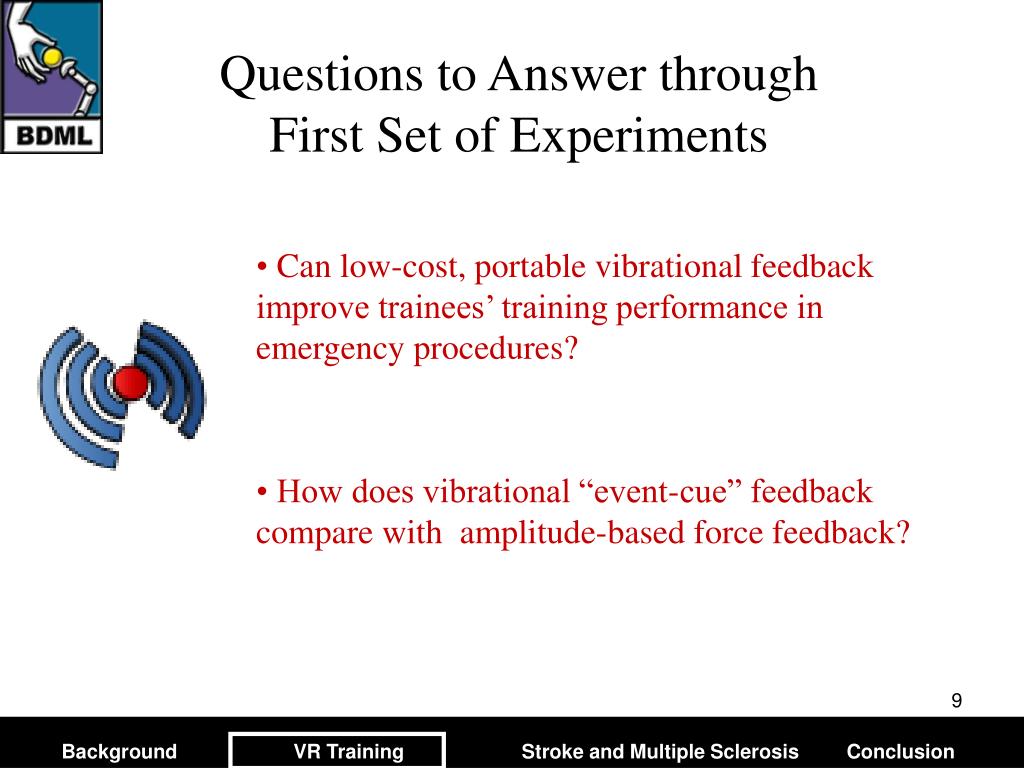 Questions to Answer through First Set of Experiments • Can low-cost, portable vibrational feedback improve trainees’ training performance in emergency procedures? • How does vibrational “event-cue” feedback compare with amplitude-based force feedback?