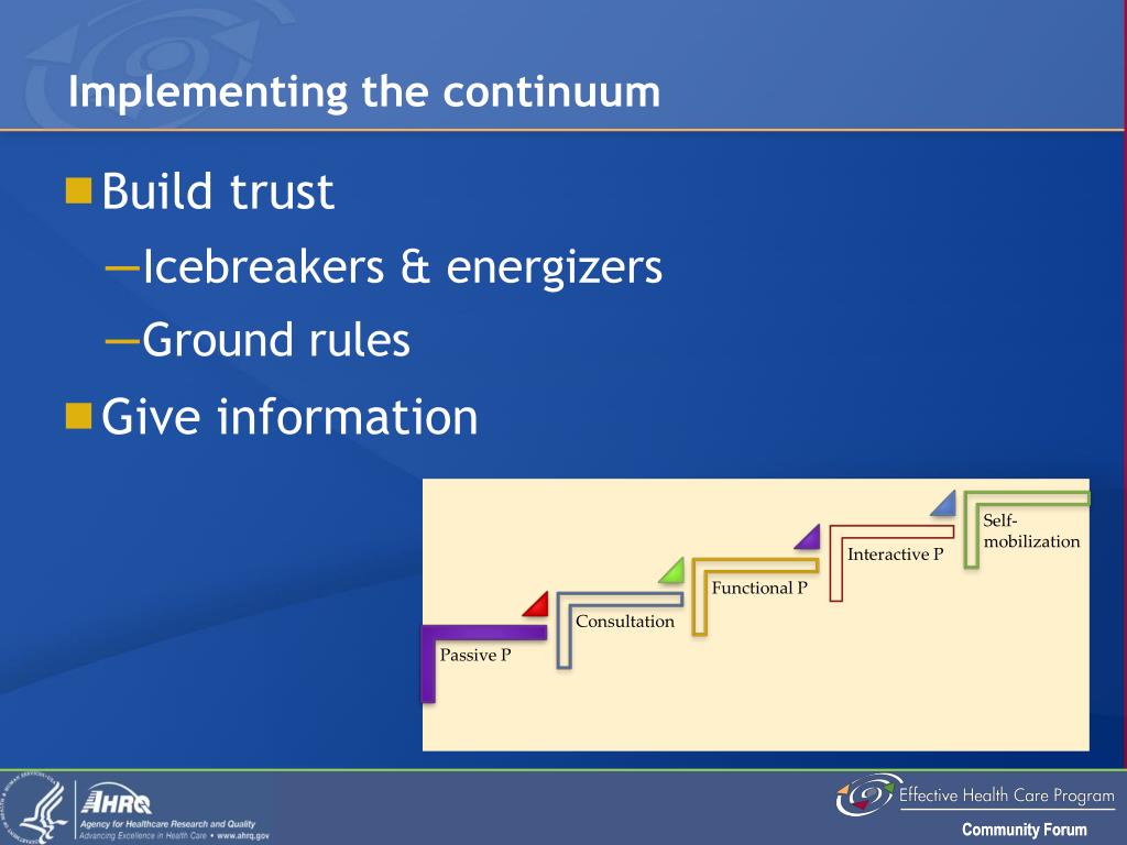 Implementing the continuum • Build trust • Icebreakers & energizers • Ground rules • Give information