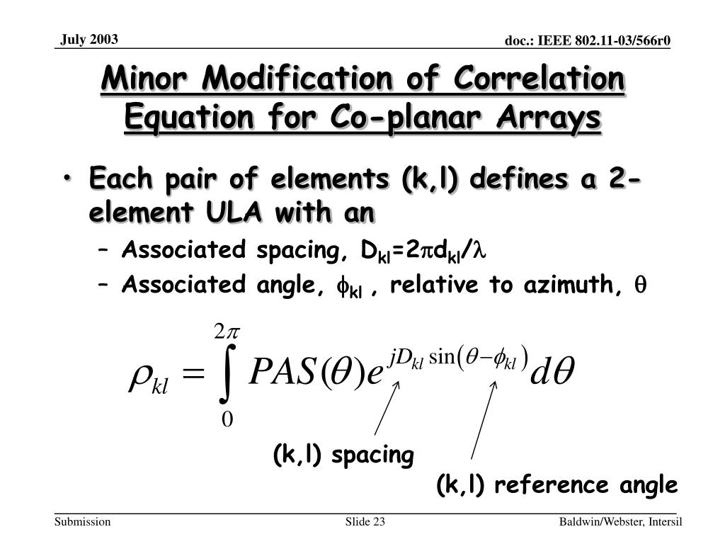Minor Modification of Correlation Equation for Co-planar Arrays • Each pair of elements (k,l) defines a 2-element ULA with an • Associated spacing, Dkl=2pdkl/l • Associated angle, fkl , relative to azimuth, q (k,l) spacing (k,l) reference angle Baldwin/Webster, Intersil