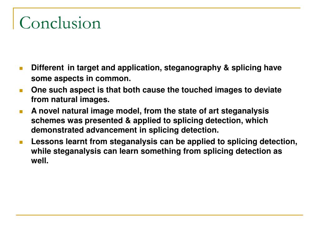 Conclusion • Differentin target and application, steganography & splicing have some aspects in common. • One such aspect is that both cause the touched images to deviate from natural images. • A novel natural image model, from the state of art steganalysis schemes was presented & applied to splicing detection, which demonstrated advancement in splicing detection. • Lessons learnt from steganalysis can be applied to splicing detection, while steganalysis can learn something from splicing detection as well.