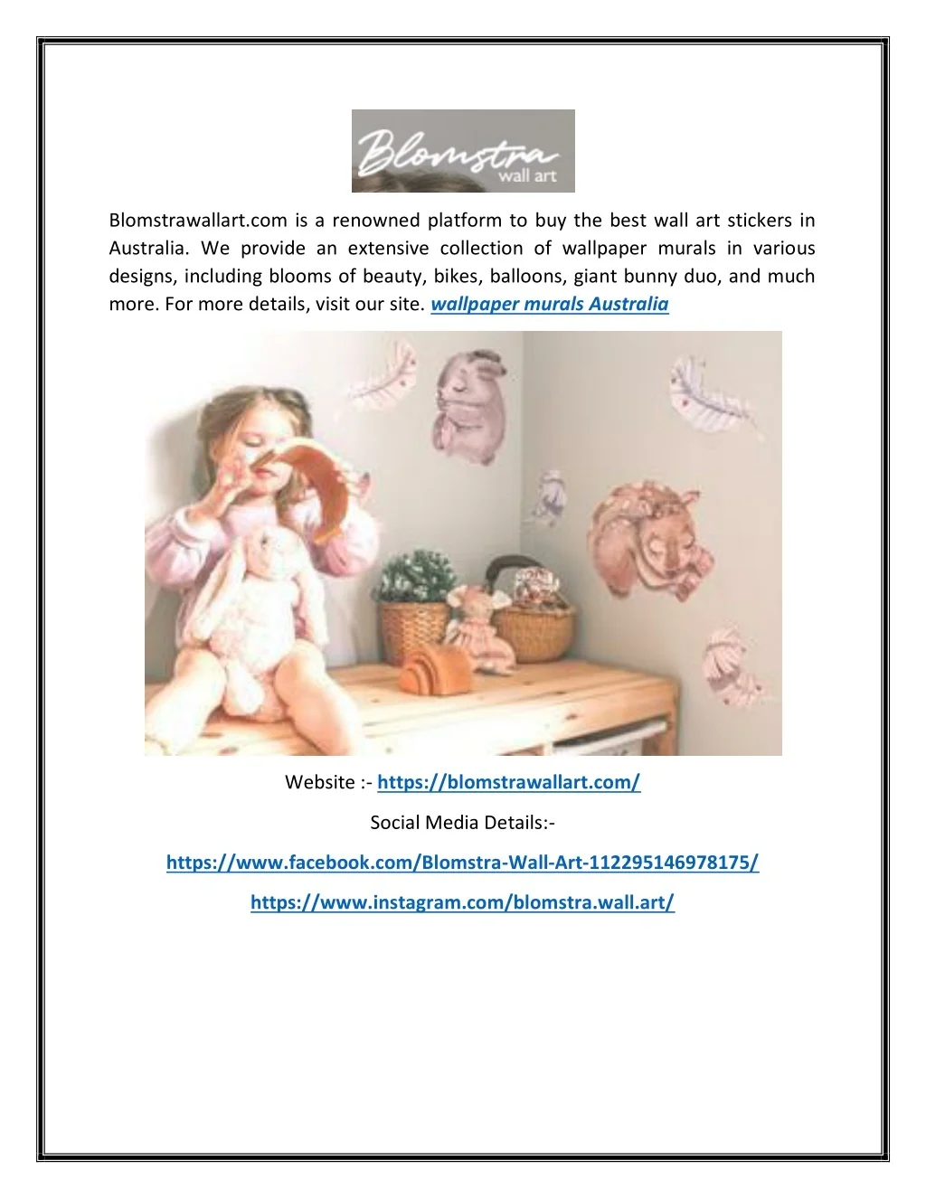 Blomstrawallart.com is a renowned platform to buy the best wall art stickers in Australia. We provide an extensive collection of wallpaper murals in various designs, including blooms of beauty, bikes, balloons, giant bunny duo, and much more. For more details, visit our site. wallpaper murals Australia Website :- https://blomstrawallart.com/ Social Media Details:- https://www.facebook.com/Blomstra-Wall-Art-112295146978175/ https://www.instagram.com/blomstra.wall.art/