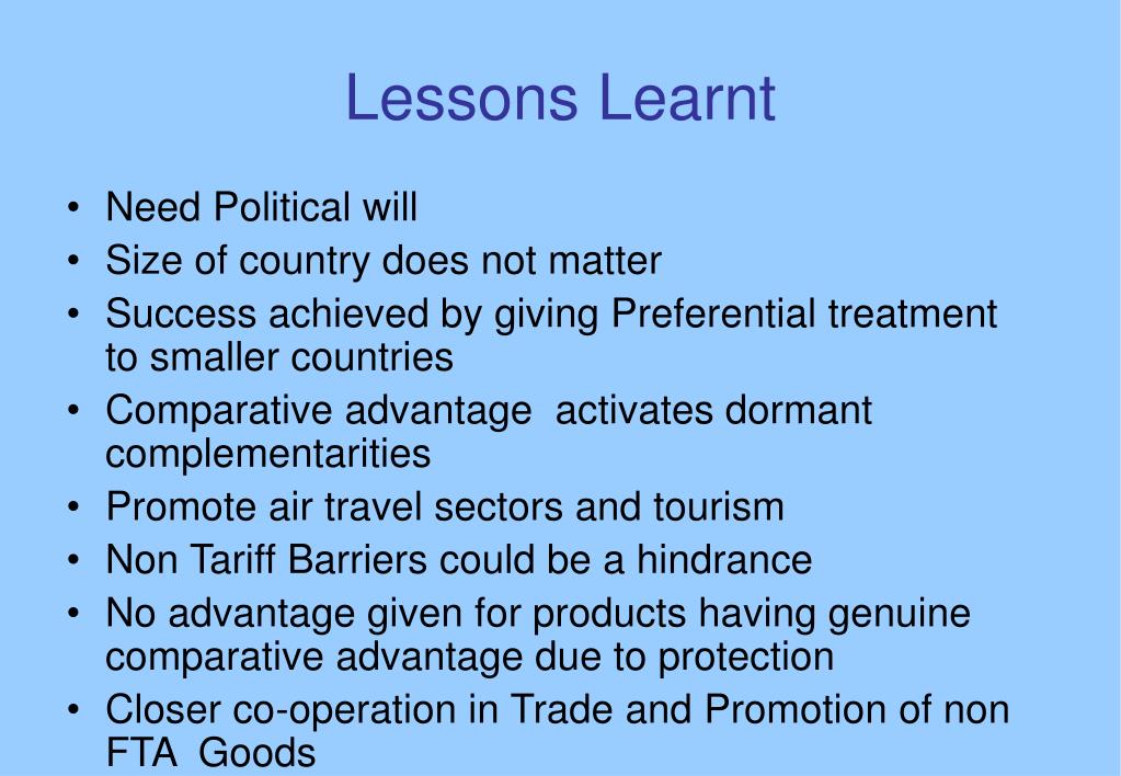 Lessons Learnt • Need Political will • Size of country does not matter • Success achieved by giving Preferential treatment to smaller countries • Comparative advantage activates dormant complementarities • Promote air travel sectors and tourism • Non Tariff Barriers could be a hindrance • No advantage given for products having genuine comparative advantage due to protection • Closer co-operation in Trade and Promotion of non FTA Goods