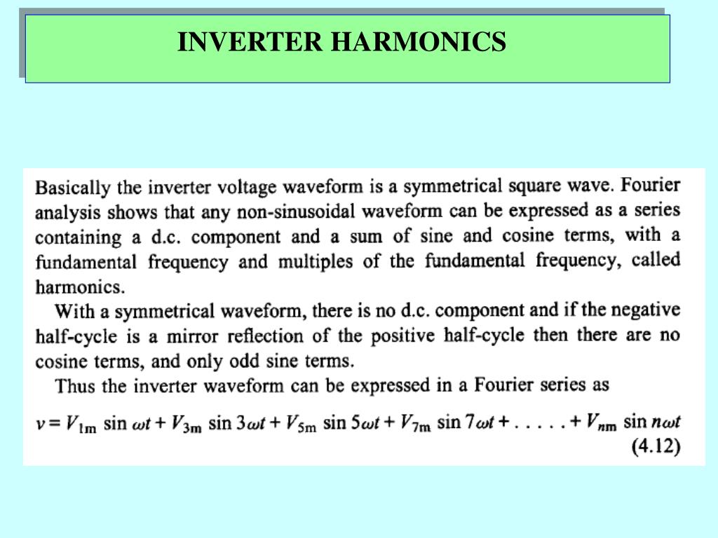 SINUSOIDAL PULSE-WIDTH MODULATION One of the methods used to reduce the low frequency harmonics in the inverter waveform is sinusoidal pulse-width modulation. In this method, a reference copy of the desired sinusoidal waveform, the modulating wave, is compared to a much higher frequency triangular waveform, called the carrier wave The resulting drive signals cause multiple turn-on of the inverter switches in each half-cycle with variable pulse width to produce a quasi-sine wave of load voltage. The pulse width increases from a very narrow width at the start of each cycle to a maximum width in the middle of each cycle. Then the pulse width reduces again after maximum until its minimum width at the end of the half-cycle period.