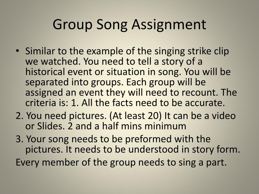 Group Song Assignment • Similar to the example of the singing strike clip we watched. You need to tell a story of a historical event or situation in song. You will be separated into groups. Each group will be assigned an event they will need to recount. The criteria is: 1. All the facts need to be accurate. 2. You need pictures. (At least 20) It can be a video or Slides. 2 and a half mins minimum 3. Your song needs to be preformed with the pictures. It needs to be understood in story form. Every member of the group needs to sing a part.
