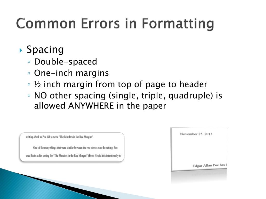 Common Errors in Formatting • Spacing • Double-spaced • One-inch margins • ½ inch margin from top of page to header • NO other spacing (single, triple, quadruple) is allowed ANYWHERE in the paper