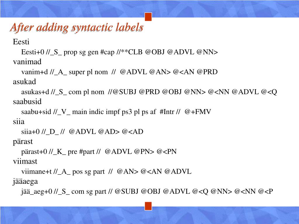 Syntactically analyzed sentence Eesti Eesti+0 //_S_ prop sg gen #cap // **CLB @NN> vanimad vanim+d //_A_ super pl nom // @AN> asukad asukas+d //_S_ com pl nom // @SUBJ saabusid saabu+sid //_V_main indic impf ps3 pl ps af #Intr // @+FMV siia siia+0 //_D_ // @ADVL pärast pärast+0 //_K_ pre #part // @ADVL viimast viimane+t //_A_ pos sg part // @AN> jääaega jää_aeg+0 //_S_ com sg part // @<P
