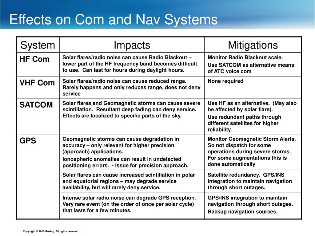 Summary • Space Weather can impact aviation in several ways • Disruption of Com (HF and SATCOM) • Degradation of Navigation • Single Event Upsets • Biological hazards for crew on high altitude polar flights • We are approaching a new solar maximum • Some increased activity is to be expected • Some degradation in HF, SATCOM and GPS performance is to be expected • Some media exaggeration as to the severity of impacts • Space Weather prediction and alerting is improving • Space weather forecasting and alerting is routinely incorporated in dispatch decisions by some airlines • We have means to deal with all of the known effects • However, improvements in performance are possible