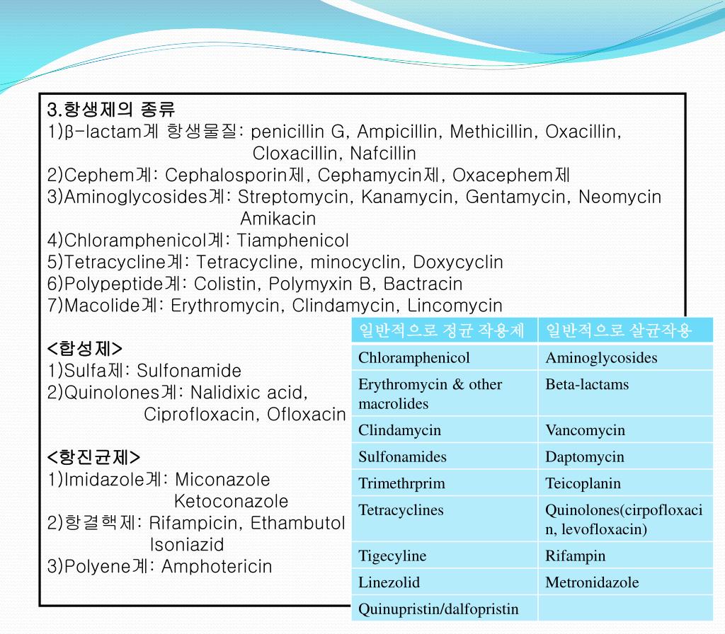 3.항생제의 종류 1)β-lactam계 항생물질: penicillinG, Ampicillin, Methicillin, Oxacillin, Cloxacillin, Nafcillin 2)Cephem계: Cephalosporin제, Cephamycin제, Oxacephem제 3)Aminoglycosides계: Streptomycin, Kanamycin, Gentamycin, Neomycin Amikacin 4)Chloramphenicol계: Tiamphenicol 5)Tetracycline계: Tetracycline, minocyclin, Doxycyclin 6)Polypeptide계: Colistin, Polymyxin B, Bactracin 7)Macolide계: Erythromycin, Clindamycin, Lincomycin <합성제> 1)Sulfa제: Sulfonamide 2)Quinolones계: Nalidixic acid, Ciprofloxacin, Ofloxacin <항진균제> 1)Imidazole계: Miconazole Ketoconazole 2)항결핵제: Rifampicin, Ethambutol Isoniazid 3)Polyene계: Amphotericin