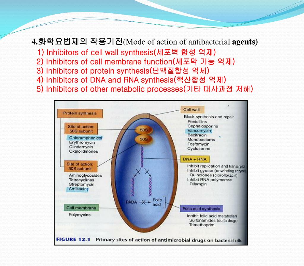 4.화학요법제의 작용기전(Mode of action of antibacterial agents) 1) Inhibitors of cell wall synthesis(세포벽 합성 억제) 2) Inhibitors of cell membrane function(세포막 기능 억제) 3)Inhibitors of protein synthesis(단백질합성 억제) 4) Inhibitors of DNA and RNA synthesis(핵산합성 억제) 5) Inhibitors of other metabolic processes(기타 대사과정 저해)