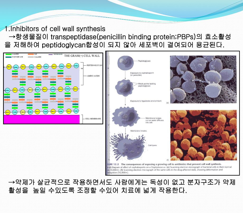 1.Inhibitors of cell wall synthesis →항생물질이 transpeptidase(penicillin binding protein;PBPs)의 효소활성을 저해하여 peptidoglycan합성이 되지 않아 세포벽이 결여되어 용균된다. →약제가 살균적으로 작용하면서도 사람에게는 독성이 없고 분자구조가 약제 활성을 높일 수있도록 조정할 수있어 치료에 넓게 작용한다.