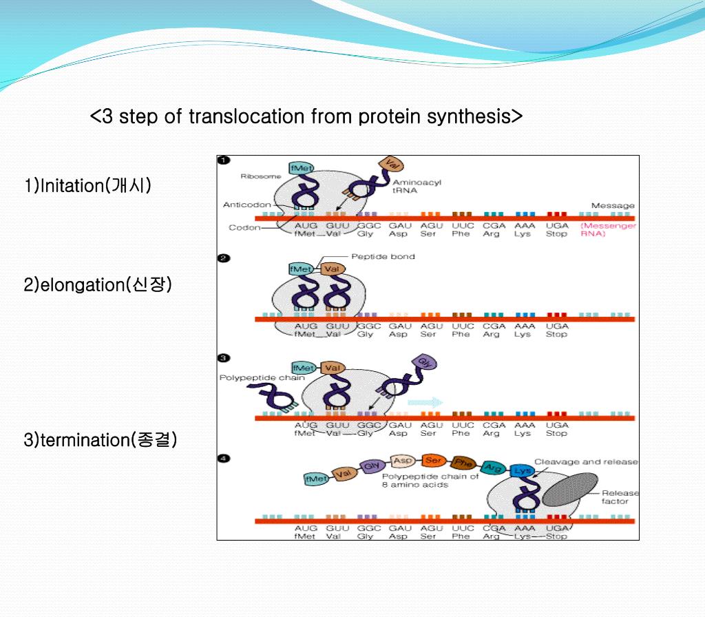 <3 step of translocation from protein synthesis> 1)Initation(개시) 2)elongation(신장) 3)termination(종결)