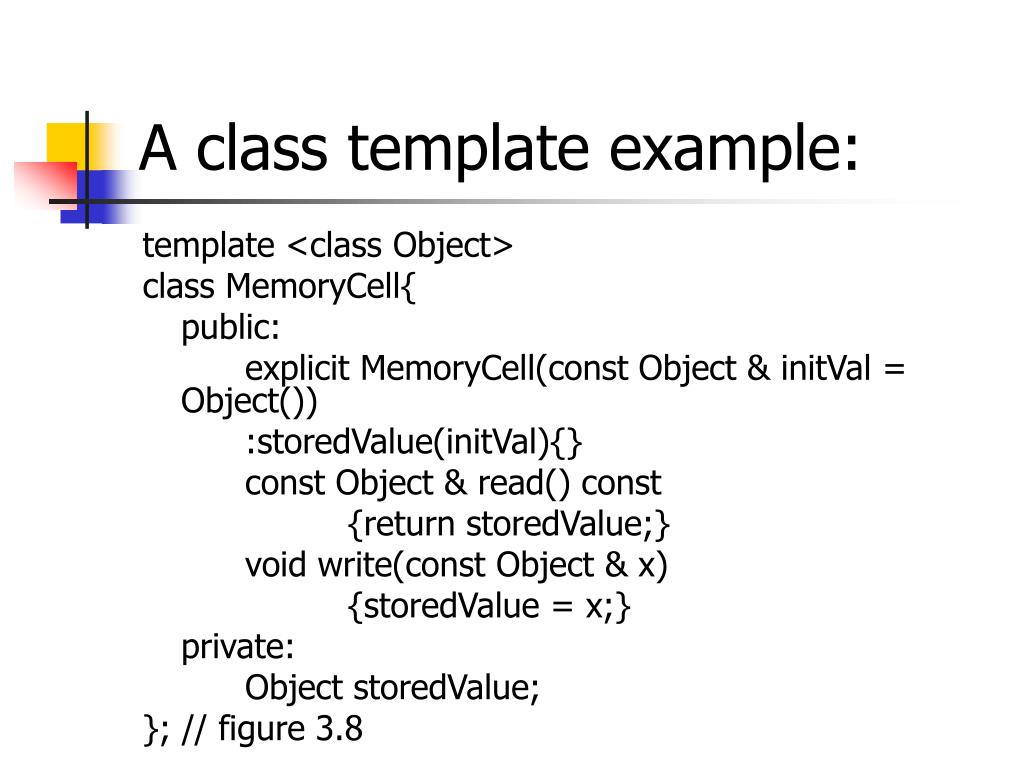 A class template example: template <class Object> class MemoryCell{ public: explicit MemoryCell(const Object & initVal = Object()) :storedValue(initVal){} const Object & read() const {return storedValue;} void write(const Object & x) {storedValue = x;} private: Object storedValue; }; // figure 3.8