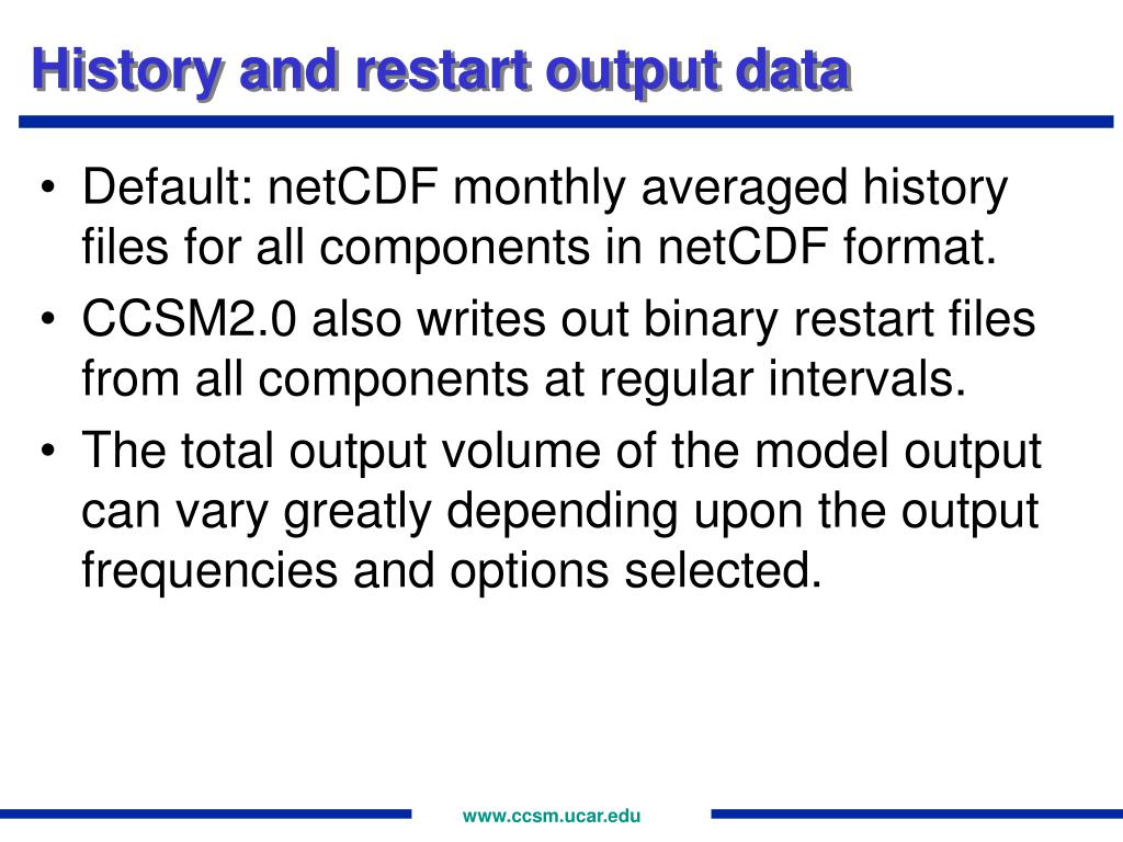 History and restart output data • Default: netCDF monthly averaged history files for all components in netCDF format. • CCSM2.0 also writes out binary restart files from all components at regular intervals. • The total output volume of the model output can vary greatly depending upon the output frequencies and options selected.