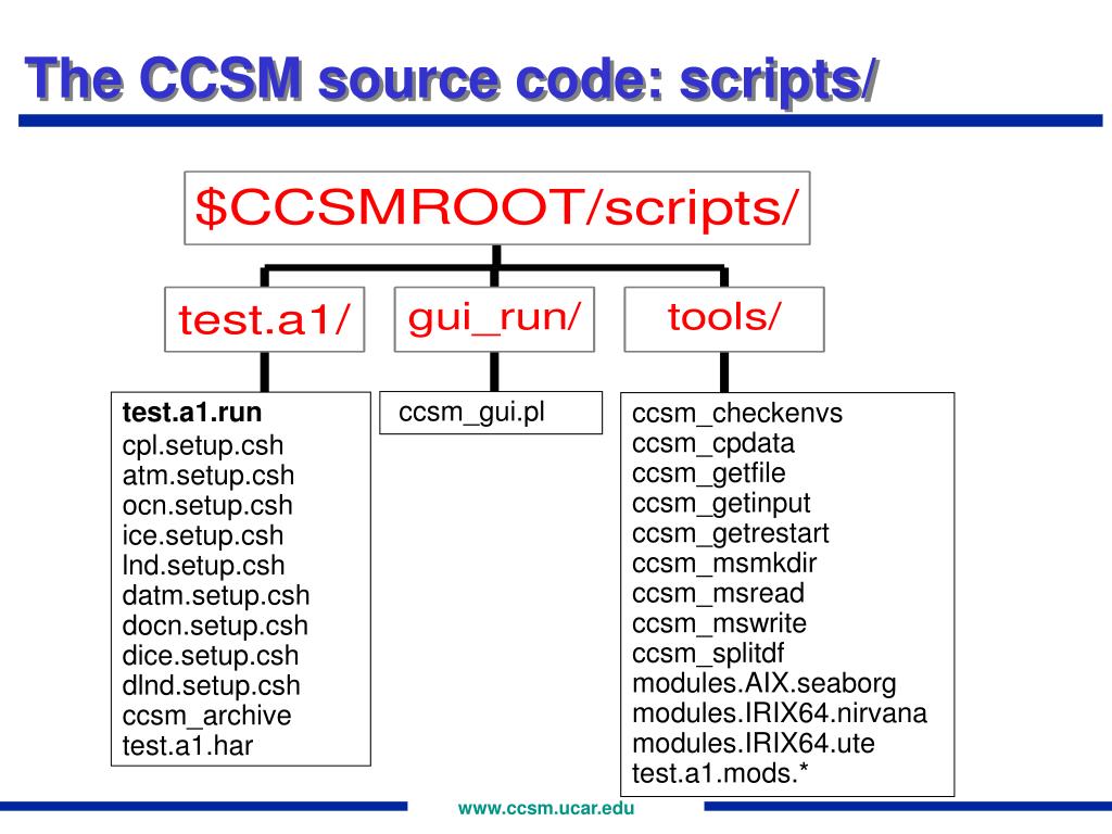 The CCSM source code: scripts/ ccsm_gui.pl test.a1.run cpl.setup.csh atm.setup.csh ocn.setup.csh ice.setup.csh lnd.setup.csh datm.setup.csh docn.setup.csh dice.setup.csh dlnd.setup.csh ccsm_archive test.a1.har ccsm_checkenvs ccsm_cpdata ccsm_getfile ccsm_getinput ccsm_getrestart ccsm_msmkdir ccsm_msread ccsm_mswrite ccsm_splitdf modules.AIX.seaborg modules.IRIX64.nirvana modules.IRIX64.ute test.a1.mods.*