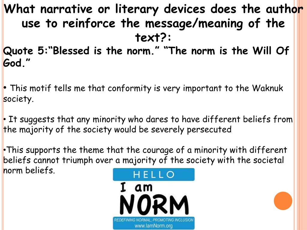What narrative or literary devices does the author use to reinforce the message/meaning of the text?: • Quote 5:“Blessed is the norm.” “The norm is the Will Of God.” • This motif tells me that conformity is very important to the Waknuk society. • It suggests that any minority who dares to have different beliefs from the majority of the society would be severely persecuted • This supports the theme that the courage of a minority with different beliefs cannot triumph over a majority of the society with the societal norm beliefs.