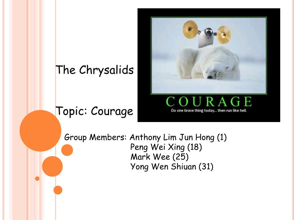 Good Morning, Kind Sirs And Ma’am. DO Give us your fullest attention as well as a healthy amount of marks. Now we shall begin our presentation. The Chrysalids Topic: Courage. Group Members: Anthony Lim Jun Hong (1) Peng Wei Xing (18)