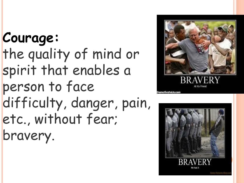 Courage:the quality of mind or spirit that enables a person to face difficulty, danger, pain, etc., without fear; bravery.