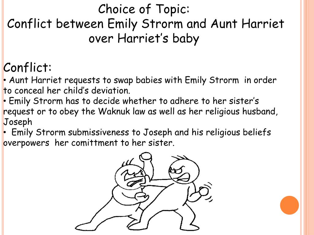 Choice of Topic: • Conflict between Emily Strorm and Aunt Harriet over Harriet’s baby • Conflict: • Aunt Harriet requests to swap babies with Emily Strorm in order to conceal her child’s deviation. • Emily Strorm has to decide whether to adhere to her sister’s request or to obey the Waknuklaw as well as her religious husband, Joseph • Emily Strorm submissiveness to Joseph and his religious beliefs overpowers her comittment to her sister.