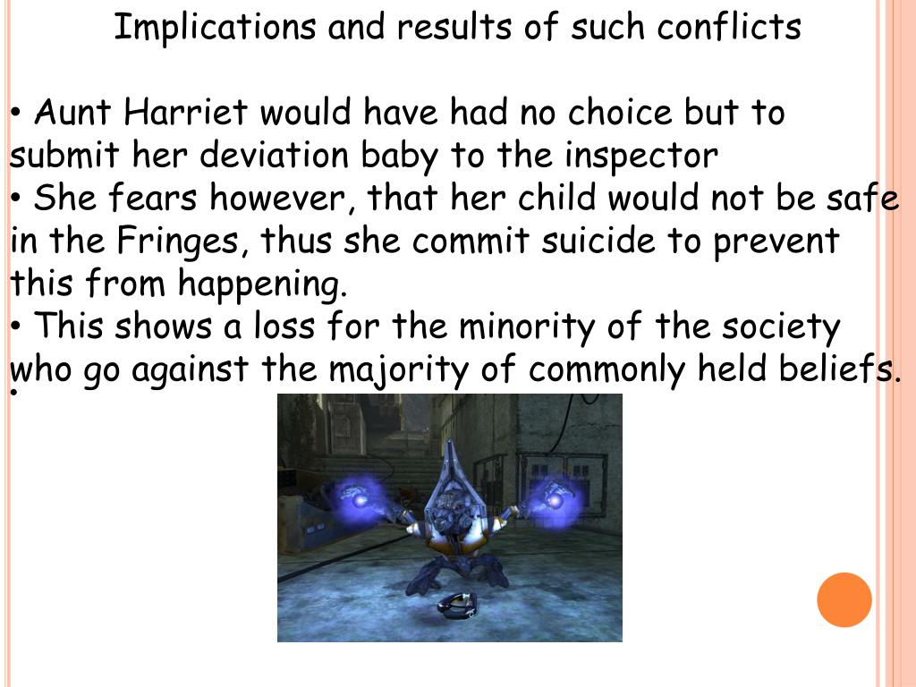 Implications and results of such conflicts • Aunt Harriet would have had no choice but to submit her deviation baby to the inspector • She fears however, that her child would not be safe in the Fringes, thus she commit suicide to prevent this from happening. • This shows a loss for the minority of the society who go against the majority of commonly held beliefs.