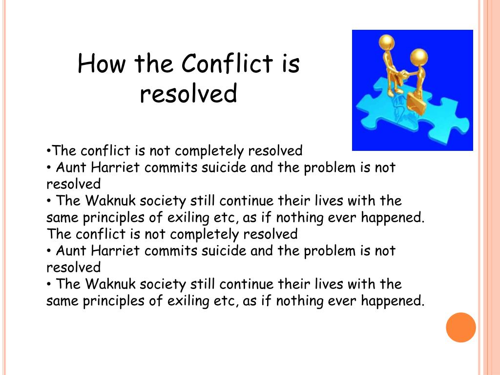 How the Conflict is resolved • The conflict is not completely resolved • Aunt Harriet commits suicide and the problem is not resolved • The Waknuk society still continue their lives with the same principles of exiling etc, as if nothing ever happened. The conflict is not completely resolved • Aunt Harriet commits suicide and the problem is not resolved • The Waknuk society still continue their lives with the same principles of exiling etc, as if nothing ever happened.