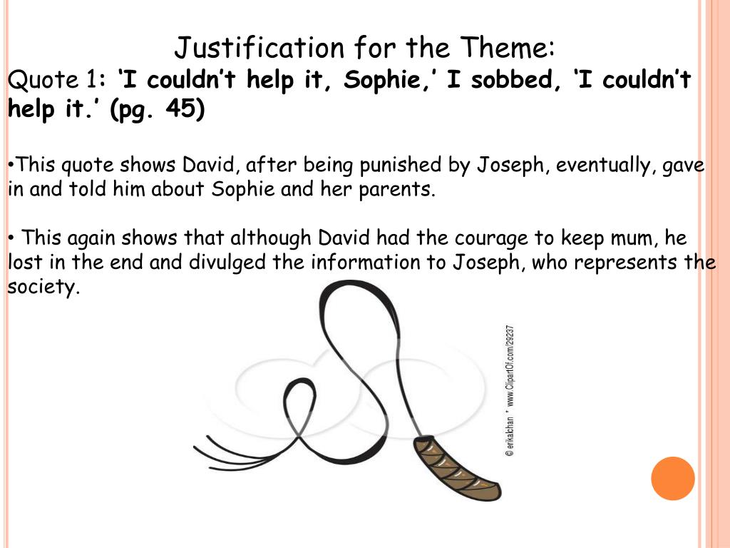Justification for the Theme: • Quote 1: ‘I couldn’t help it, Sophie,’ I sobbed, ‘I couldn’t help it.’ (pg. 45) • This quote shows David, after being punished by Joseph, eventually, gave in and told him about Sophie and her parents. • This again shows that although David had the courage to keep mum, he lost in the end and divulged the information to Joseph, who represents the society.