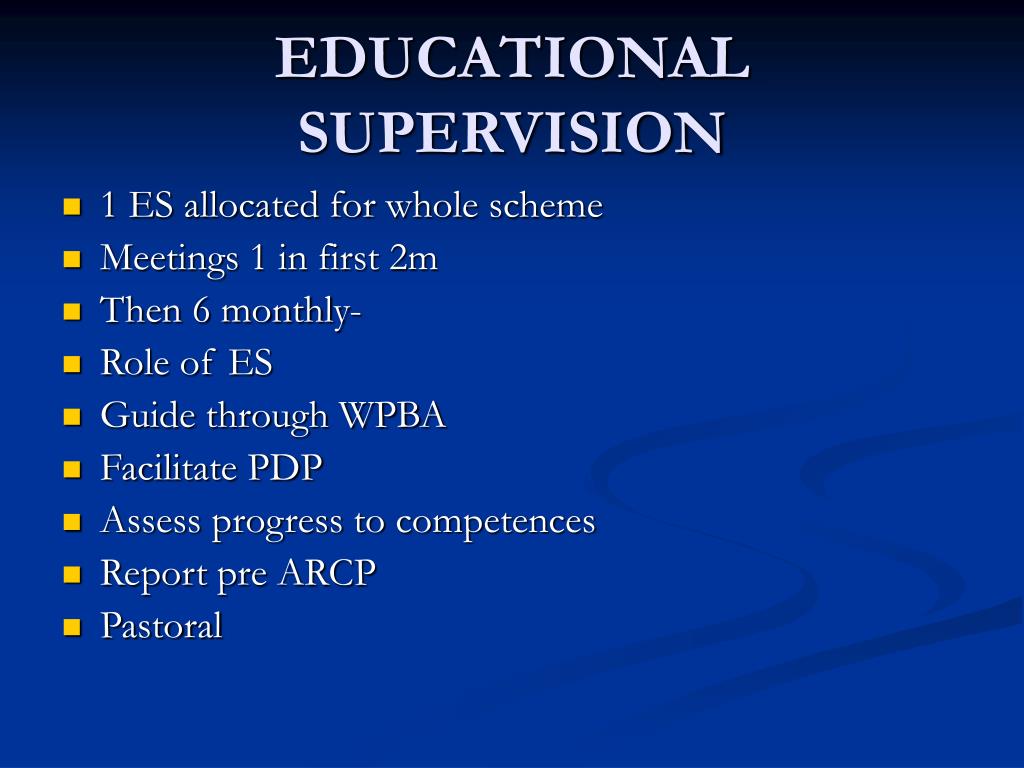 EDUCATIONAL SUPERVISION • 1 ES allocated for whole scheme • Meetings 1 in first 2m • Then 6 monthly- • Role of ES • Guide through WPBA • Facilitate PDP • Assess progress to competences • Report pre ARCP • Pastoral