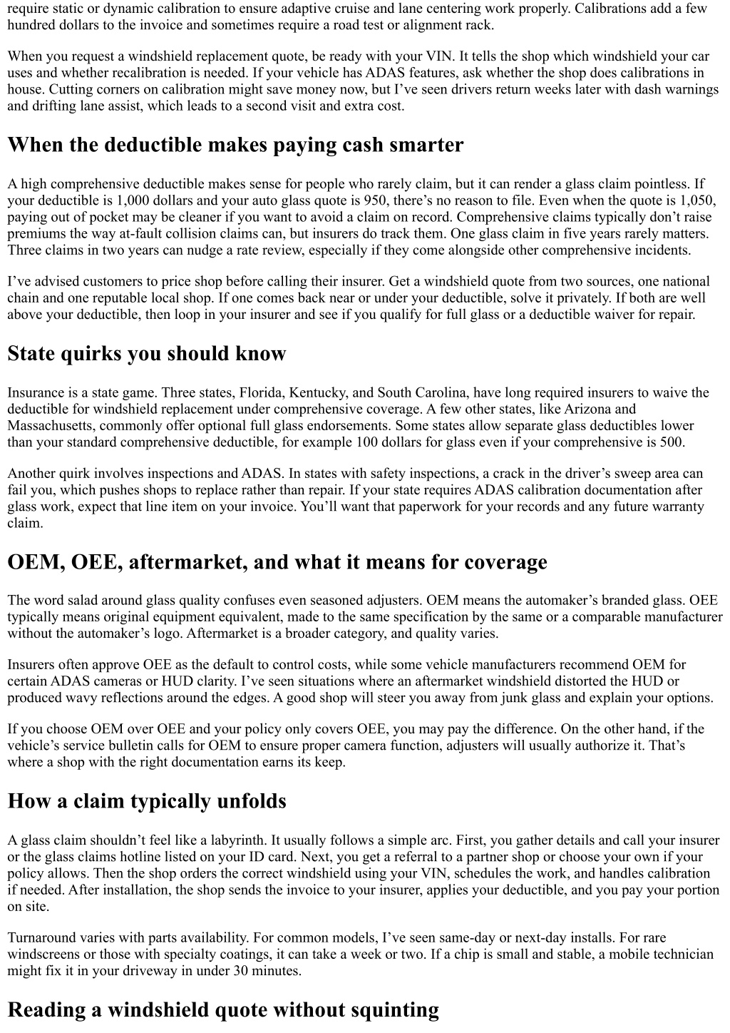 require static or dynamic calibration to ensure adaptive cruise and lane centering work properly. Calibrations add a few hundred dollars to the invoice and sometimes require a road test or alignment rack. When you request a windshield replacement quote, be ready with your VIN. It tells the shop which windshield your car uses and whether recalibration is needed. If your vehicle has ADAS features, ask whether the shop does calibrations in house. Cutting corners on calibration might save money now, but I’ve seen drivers return weeks later with dash warnings and drifting lane assist, which leads to a second visit and extra cost. When the deductible makes paying cash smarter A high comprehensive deductible makes sense for people who rarely claim, but it can render a glass claim pointless. If your deductible is 1,000 dollars and your auto glass quote is 950, there’s no reason to file. Even when the quote is 1,050, paying out of pocket may be cleaner if you want to avoid a claim on record. Comprehensive claims typically don’t raise premiums the way at‑fault collision claims can, but insurers do track them. One glass claim in five years rarely matters. Three claims in two years can nudge a rate review, especially if they come alongside other comprehensive incidents. I’ve advised customers to price shop before calling their insurer. Get a windshield quote from two sources, one national chain and one reputable local shop. If one comes back near or under your deductible, solve it privately. If both are well above your deductible, then loop in your insurer and see if you qualify for full glass or a deductible waiver for repair. State quirks you should know Insurance is a state game. Three states, Florida, Kentucky, and South Carolina, have long required insurers to waive the deductible for windshield replacement under comprehensive coverage. A few other states, like Arizona and Massachusetts, commonly offer optional full glass endorsements. Some states allow separate glass deductibles lower than your standard comprehensive deductible, for example 100 dollars for glass even if your comprehensive is 500. Another quirk involves inspections and ADAS. In states with safety inspections, a crack in the driver’s sweep area can fail you, which pushes shops to replace rather than repair. If your state requires ADAS calibration documentation after glass work, expect that line item on your invoice. You’ll want that paperwork for your records and any future warranty claim. OEM, OEE, aftermarket, and what it means for coverage The word salad around glass quality confuses even seasoned adjusters. OEM means the automaker’s branded glass. OEE typically means original equipment equivalent, made to the same specification by the same or a comparable manufacturer without the automaker’s logo. Aftermarket is a broader category, and quality varies. Insurers often approve OEE as the default to control costs, while some vehicle manufacturers recommend OEM for certain ADAS cameras or HUD clarity. I’ve seen situations where an aftermarket windshield distorted the HUD or produced wavy reflections around the edges. A good shop will steer you away from junk glass and explain your options. If you choose OEM over OEE and your policy only covers OEE, you may pay the difference. On the other hand, if the vehicle’s service bulletin calls for OEM to ensure proper camera function, adjusters will usually authorize it. That’s where a shop with the right documentation earns its keep. How a claim typically unfolds A glass claim shouldn’t feel like a labyrinth. It usually follows a simple arc. First, you gather details and call your insurer or the glass claims hotline listed on your ID card. Next, you get a referral to a partner shop or choose your own if your policy allows. Then the shop orders the correct windshield using your VIN, schedules the work, and handles calibration if needed. After installation, the shop sends the invoice to your insurer, applies your deductible, and you pay your portion on site. Turnaround varies with parts availability. For common models, I’ve seen same‑day or next‑day installs. For rare windscreens or those with specialty coatings, it can take a week or two. If a chip is small and stable, a mobile technician might fix it in your driveway in under 30 minutes. Reading a windshield quote without squinting