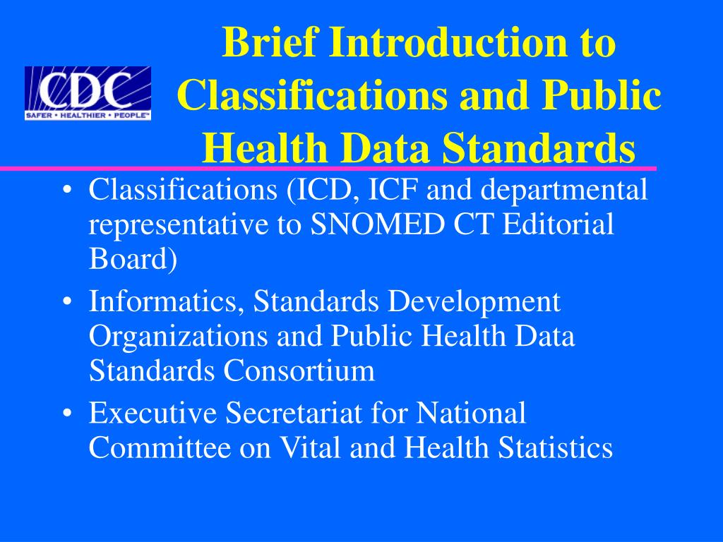 Brief Introduction to Classifications and Public Health Data Standards • Classifications (ICD, ICF and departmental representative to SNOMED CT Editorial Board) • Informatics, Standards Development Organizations and Public Health Data Standards Consortium • Executive Secretariat for National Committee on Vital and Health Statistics