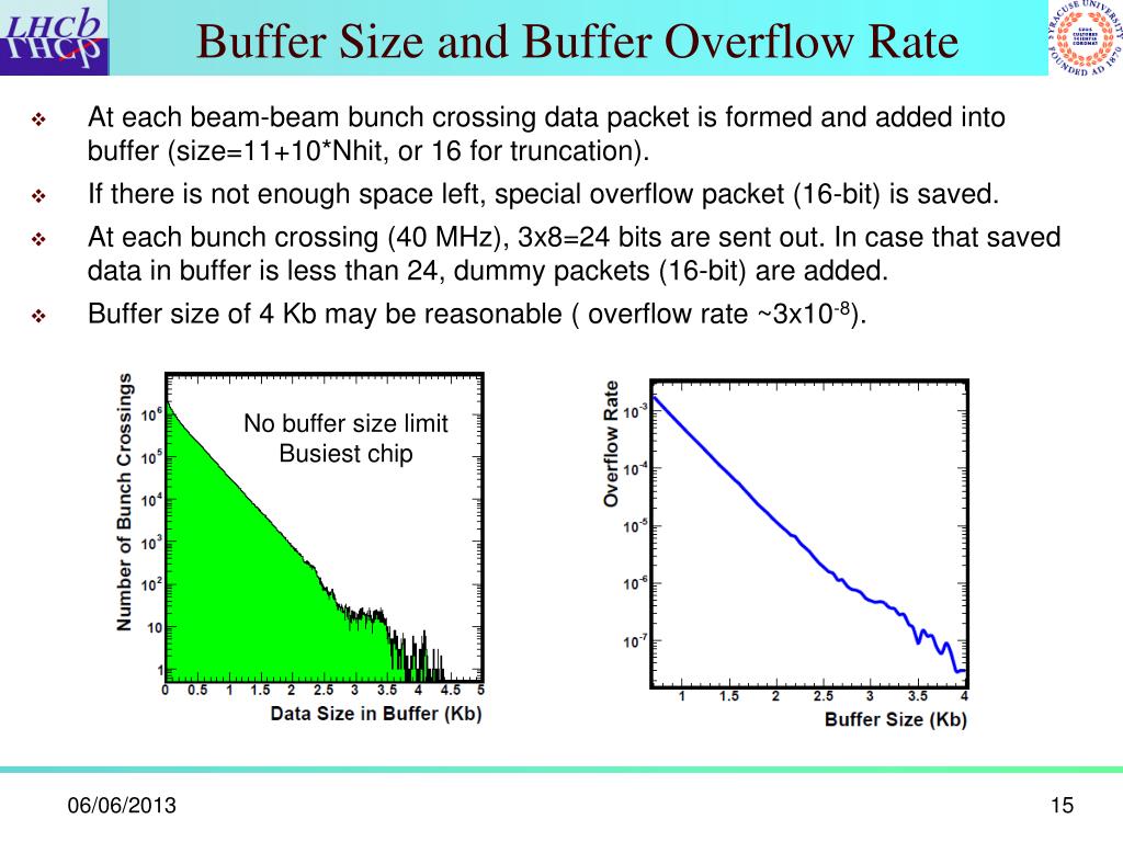 Buffer Size and Buffer Overflow Rate • At each beam-beam bunch crossing data packet is formed and added into buffer (size=11+10*Nhit, or 16 for truncation). • If there is not enough space left, special overflow packet (16-bit) is saved. • At each bunch crossing (40 MHz), 3x8=24 bits are sent out. In case that saved data in buffer is less than 24, dummy packets (16-bit) are added. • Buffer size of 4 Kb may be reasonable ( overflow rate ~3x10-8). No buffer size limit Busiest chip