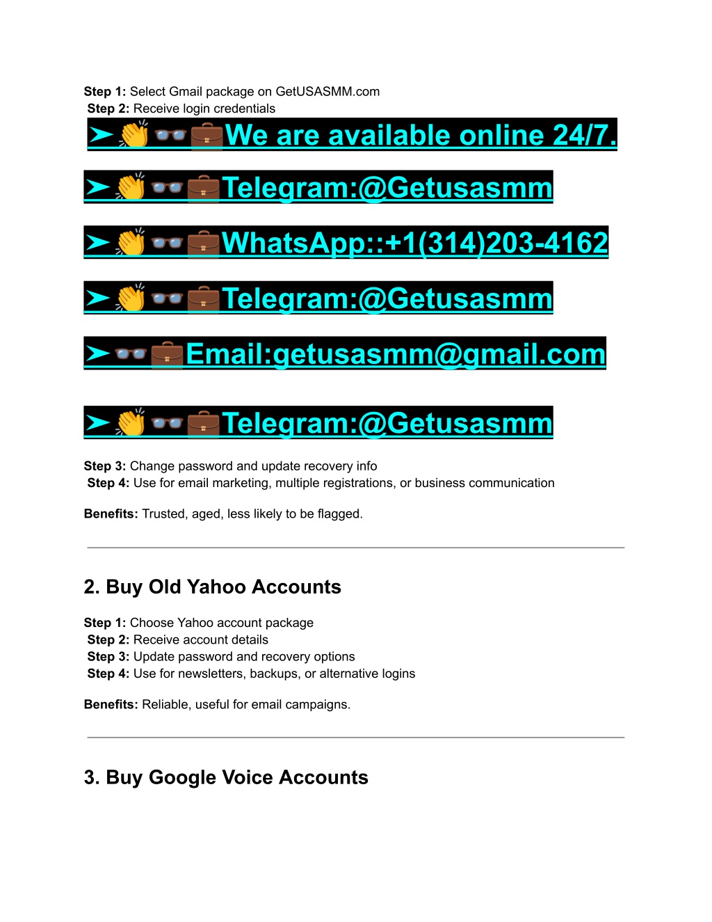 2. Step 1: Select Gmail package on GetUSASMM.com Step 2: Receive login credentials ➤???We are available online 24/7. ➤???Telegram:@Getusasmm ➤???WhatsApp::+1(314)203-4162 ➤???Telegram:@Getusasmm ➤??Email:getusasmm@gmail.com ➤???Telegram:@Getusasmm Step 3: Change password and update recovery info Step 4: Use for email marketing, multiple registrations, or business communication Benefits: Trusted, aged, less likely to be flagged. 2. Buy Old Yahoo Accounts Step 1: Choose Yahoo account package Step 2: Receive account details Step 3: Update password and recovery options Step 4: Use for newsletters, backups, or alternative logins Benefits: Reliable, useful for email campaigns. 3. Buy Google Voice Accounts