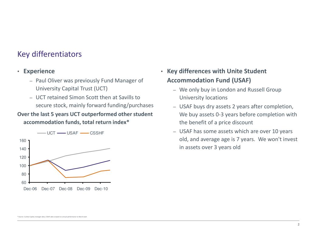 Key differentiators • Experience • Paul Oliver was previously Fund Manager of University Capital Trust (UCT) • UCT retained Simon Scott then at Savills to secure stock, mainly forward funding/purchases Over the last 5 years UCT outperformed other student accommodation funds, total return index* • Key differences with Unite Student Accommodation Fund (USAF) • We only buy in London and Russell Group University locations • USAF buys dry assets 2 years after completion, We buy assets 0-3 years before completion with the benefit of a price discount • USAF has some assets which are over 10 years old, and average age is 7 years. We won't invest in assets over 3 years old * Source: Curlew Capital, manager data, CSSHF data is based on annual performance to March each