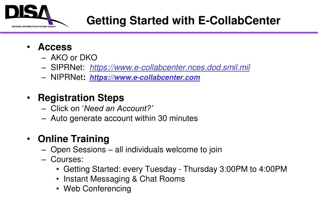 Getting Started with E-CollabCenter • Access • AKO or DKO • SIPRNet: https://www.e-collabcenter.nces.dod.smil.mil • NIPRNet: https://www.e-collabcenter.com • Registration Steps • Click on ‘Need an Account?’ • Auto generate account within 30 minutes • Online Training • Open Sessions – all individuals welcome to join • Courses: • Getting Started: every Tuesday - Thursday 3:00PM to 4:00PM • Instant Messaging & Chat Rooms • Web Conferencing