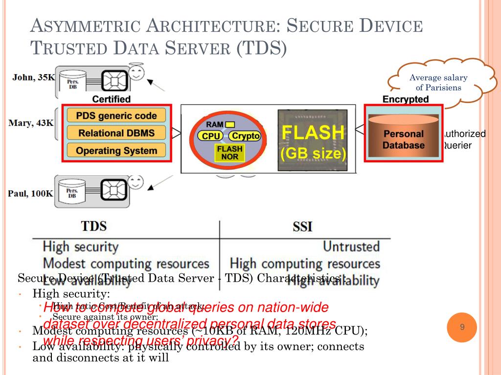 Asymmetric Architecture: Secure DeviceTrusted Data Server (TDS) Average salary of Parisiens Authorized Querier • Secure Device (Trusted Data Server - TDS) Characteristics : • High security: • High ratio Cost/Benefit of an attack; • Secure against its owner; • Modest computing resources (~10KB of RAM, 120MHz CPU); • Low availability: physically controlled by its owner; connects and disconnects at it will How to compute global queries on nation-wide dataset over decentralized personal data stores while respecting users’ privacy?