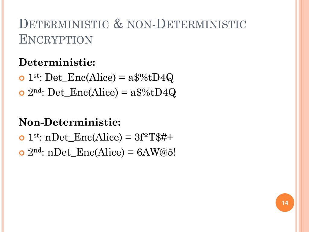 Deterministic & non-Deterministic Encryption Deterministic: • 1st: Det_Enc(Alice) = a$%tD4Q • 2nd: Det_Enc(Alice) = a$%tD4Q Non-Deterministic: • 1st: nDet_Enc(Alice) = 3f*T$#+ • 2nd: nDet_Enc(Alice) = 6AW@5!
